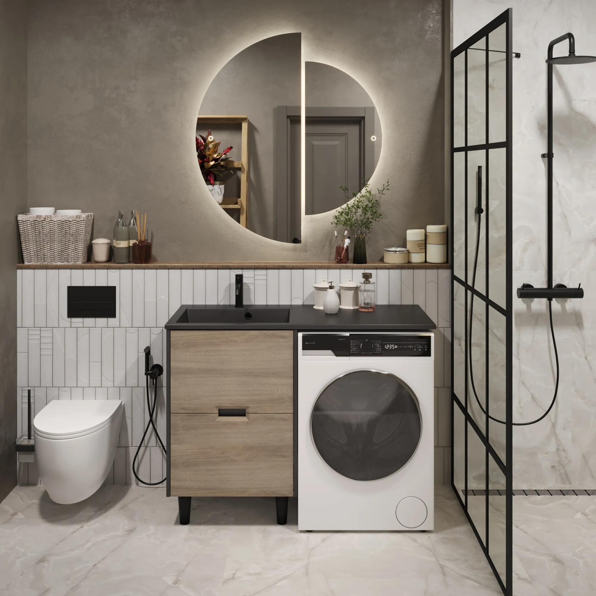 Тумба под раковину* и стиральную машину Maid – элегантное и функциональное решение, она создает гармоничное пространство в ванной комнате. Искусное сочетание антрацита и "ореха лучистого европейского" придает тумбе изысканный вид, а два вместительных ящика помогут легко организовать порядок. Акцентные опоры черного цвета гармонично дополнят ваш выбор: строгая графитовая или нежная белая раковина – для создания неповторимого стиля ванной комнаты.Характеристики: