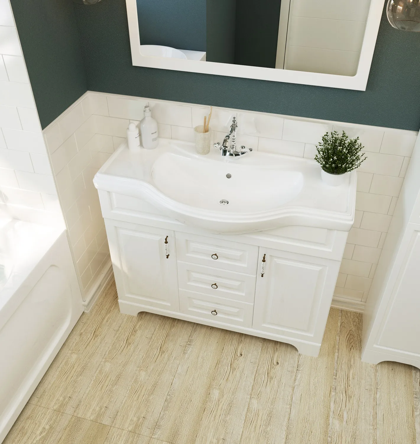 Тумба в классической благородной стилистике, которая разделена на несколько функциональных отсеков разного размера, благодаря чему превосходно подходит для хранения самых разнообразных предметов и личных вещей. Она станет прекрасным выбором для тех, кто ищет безупречное сочетание эстетики и функциональности в мебели для ванной комнаты. Изящная и элегантная, эта тумба отражает дух прованса и станет актуальным и уместным дополнением самых взыскательных традиционных интерьеров. Комфорт и удобство ее использования обеспечиваются качественной, проверенной временем немецкой фурнитурой Hettich.